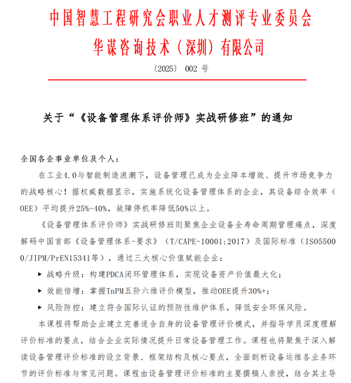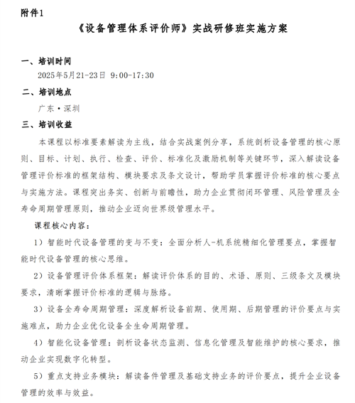 首頁 > 新聞中心>公司動態>【課程通知】關于召開“《設備管理體系評價師》實戰研修班”的通知