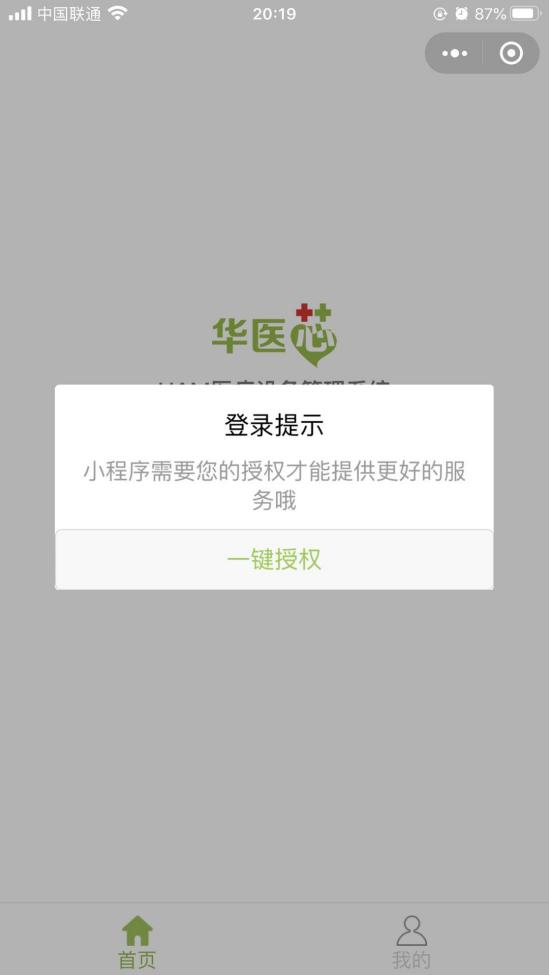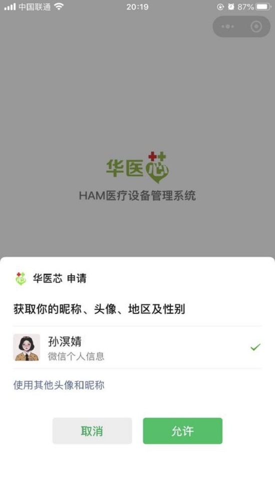 微信搜索“華醫芯”小程序并點擊進入,第一次登陸需要進行相關授權與認證