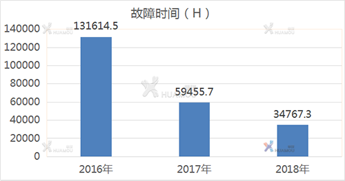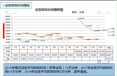 2)2016年每月設備平均故障時間(所有設備)13萬分鐘,2017年設備平均故障時間5.9萬分鐘,2018年設備平均故障時間3萬分鐘,通過2年設備管理改善降低設備故障時間77%。