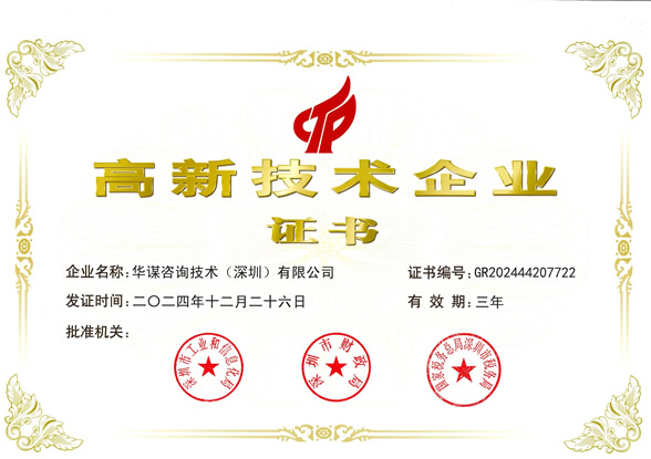 根據(jù)國(guó)家《高新技術(shù)企業(yè)認(rèn)定管理辦法》和《高新技術(shù)企業(yè)認(rèn)定管理工作指引》的有關(guān)規(guī)定,華謀咨詢(xún)技術(shù)(深圳)有限公司憑借團(tuán)隊(duì)專(zhuān)業(yè)技術(shù)研發(fā)能力、持續(xù)創(chuàng)新能力和企業(yè)管理能力,順利通過(guò)由科技部、財(cái)政部、稅務(wù)總局組織的國(guó)家高新技術(shù)企業(yè)認(rèn)定,目前,華謀咨詢(xún)技術(shù)(深圳)有限公司是國(guó)內(nèi)管理咨詢(xún)領(lǐng)域內(nèi)獲得國(guó)家高新技術(shù)企業(yè)認(rèn)證的企業(yè)。