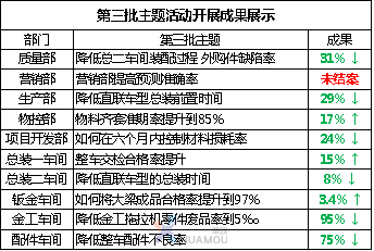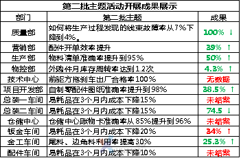 6)從各車間選定3條樣板線效率改善,其中總裝一、總裝二全部達標,配件車間庫存下降50%;