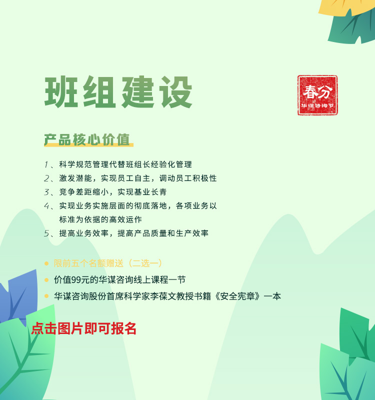 華謀咨詢集團根據(jù)100多家企業(yè)服務(wù)經(jīng)驗開發(fā)五星班組管理咨詢產(chǎn)品。以推進班組管理各方面業(yè)務(wù)的標準化開始,從班組管理規(guī)范化開始,逐步推進班組的品質(zhì)管理能力,效率管理能力,成本管理能力,逐步達到班組自主管理的程度。